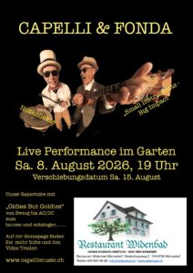 Samstag, 8. August 2026 ab 19.00 Uhr bei schönem Wetter im Platanengarten „Oldies But Goldies“ von Swing bis AC/DC zum tanzen und mitsingen……. Eintritt gratis / Kollekte Verschiebungsdatum: Samstag, 15. August 2026